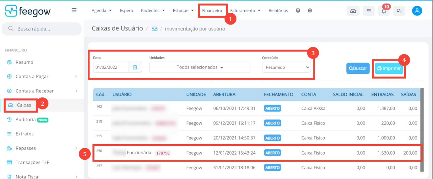 Para que o usuário possa realizar as funcionalidades dos Caixas, o usuário precisará possuir a permissão indicada ("Caixas dos Usuários") e selecionar no menu superior à opção de Financeiro (1), e após, a opção de Caixas (2), no menu esquerdo.
