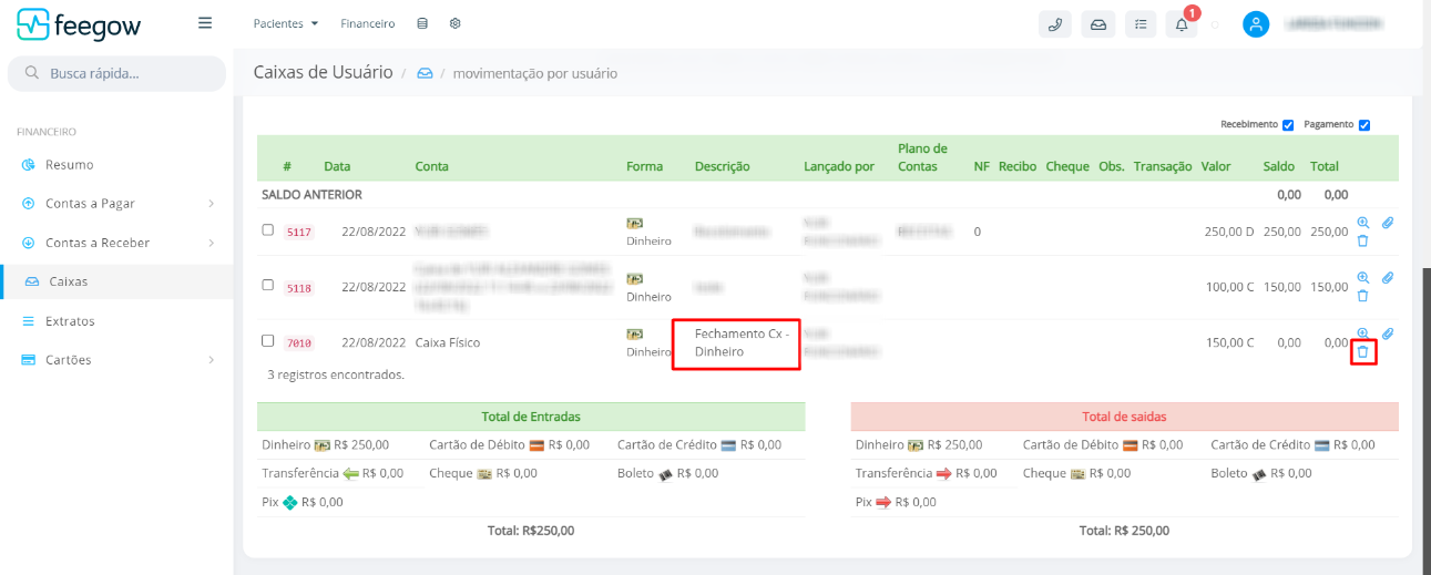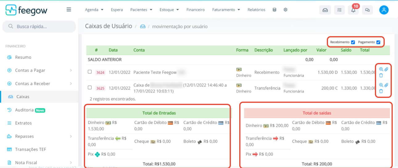 No extrato do caixa do usuário, constarão as movimentações e na parte inferior constará um relatório sintético do Total de Entradas e Total de Saídas conforme a forma de pagamento/recebimento.